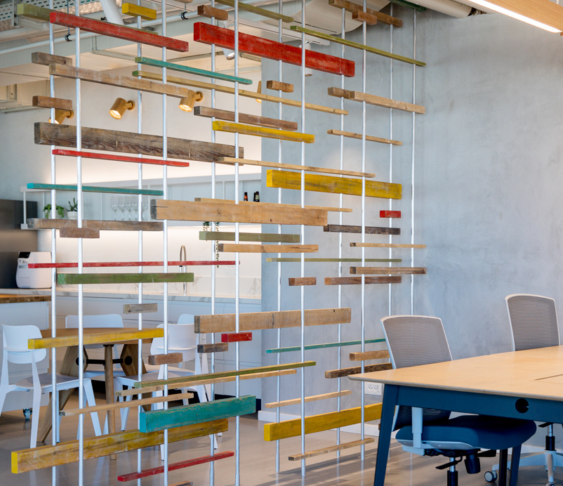 整個辦公室裝修設計中,最獨特的莫過了這個隔斷墻的設計了,說是隔斷,也是斷非斷的感覺,采用多種不同規格、不同長短、不同寬度的木條,再涂上不同的顏色,有著相互碰撞感,也增添了一絲活力,遠遠看去就像一柵格窗簾,奇妙又好看。