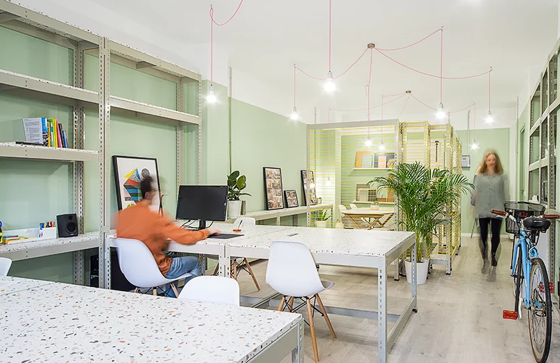 該工作室分為兩個區(qū)域:與入口接觸的會議室,以及位于房間后面并與自然光入口接觸的工作區(qū)。將這兩個區(qū)域分開,有一個鋼結構和紡織品穿插的分隔框,覆蓋了整個區(qū)域。辦公室的室內(nèi)裝修采用了很多水磨石來裝飾,包括桌面,置物臺,前臺等等
