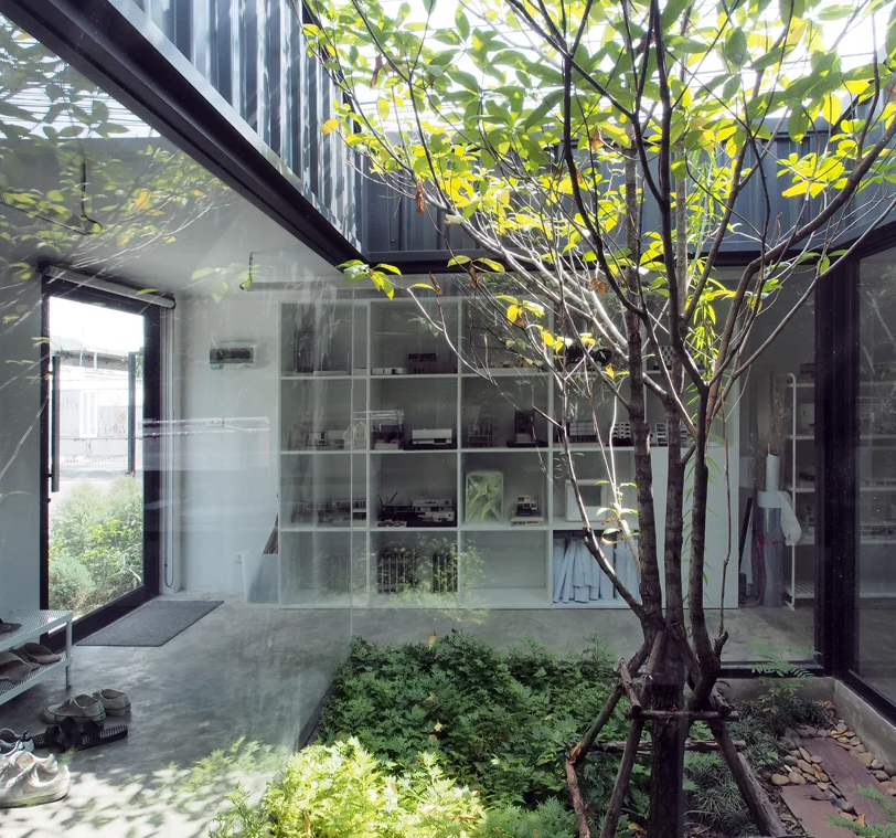 該建筑采用金屬板材覆蓋屋頂和外墻。單層建筑還采用了不對稱的斜面屋頂,其面積為49平方米,有6平方米的庭院被打開,里面有一小塊綠化地帶,帶來了光線和生機。