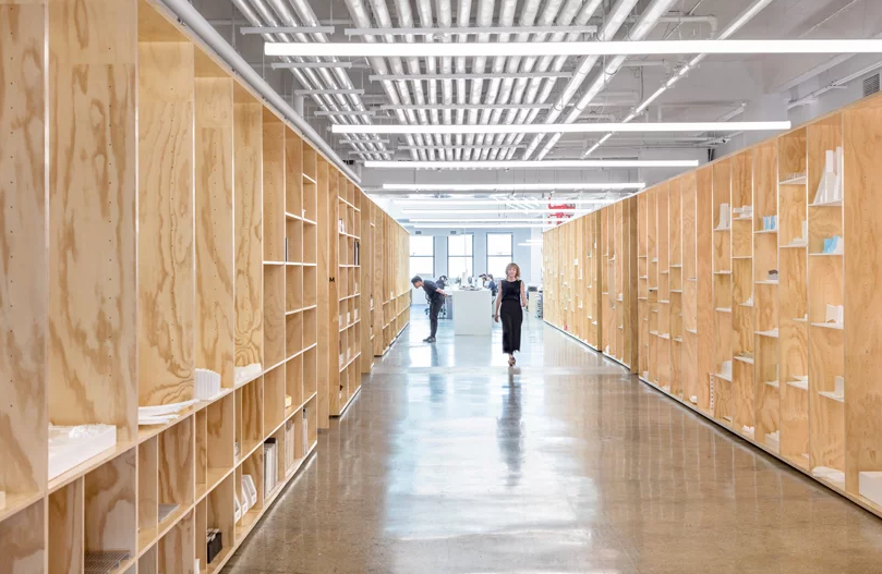 南邊有一座畫廊從東到西相連。這個畫廊是兩旁的展覽貨架,與工作室圖書館的建筑樣品相對。這個空間被一個由150個長長的白色燈照亮。