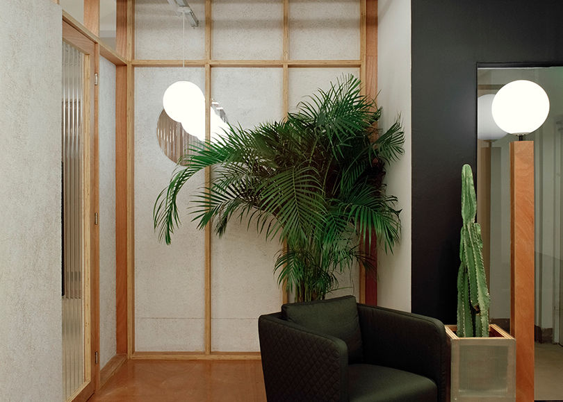 裝修以膠合板和混凝土為主要材料,完成了以幾何照明裝置和綠色植物為特色的室內(nèi)設(shè)計(jì)。聚碳酸酯隔板作為設(shè)計(jì)的主要組成部分,允許一個(gè)適合現(xiàn)代工作場(chǎng)所的透明環(huán)境。下面一起跟著