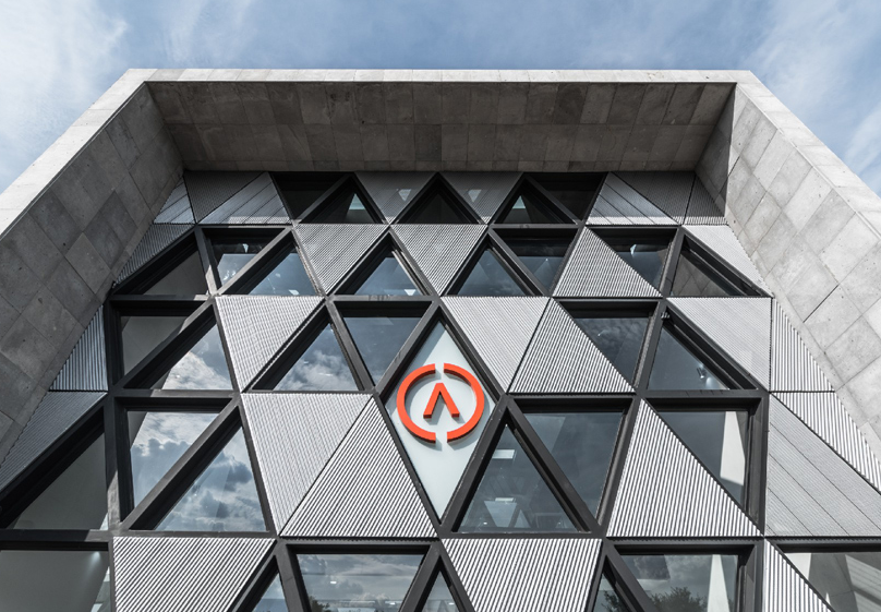 為了與綠樹成蔭的溪流建立聯(lián)系,從公司的大堂就營造了視覺效果。同時(shí),延伸到建筑外部的外部露臺。外主立面設(shè)計(jì)為三角形圖案,以公司的企業(yè)形象為參照,具有象征性和獨(dú)特性,圖案的基本模塊對應(yīng)于組織標(biāo)識的同型,該標(biāo)識包含在立面的中心部分。