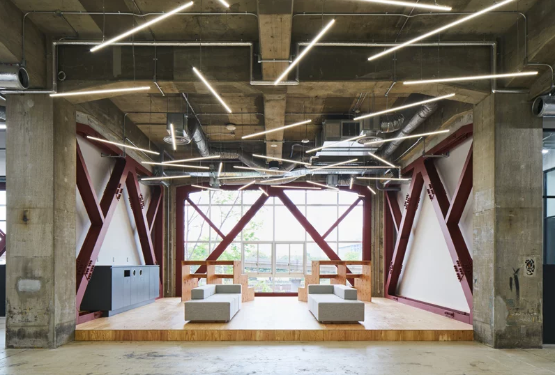 占地面積7500平方米、天花板高度6米的寬敞空間中,辦公室裝修設計利用現有空間的潛力和規模感,通過使用抗震支撐、涂有防銹漆的休息室、卡車泊位坡道以及簡單清理過的現有混凝土墻,辦公室裝修設計還充分利用了現有空間的潛力和規模感。