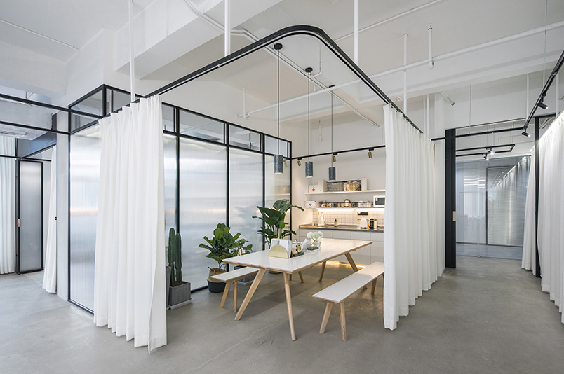 這家辦公室在深圳,一個透明的單色開放空間,辦公室裝修設計上采用了一些工業設計。辦公室裝修的現代建筑的規律與空間中用作隔斷和陰影的白色亞麻布窗簾的柔軟和微妙形成對比。下面就跟著華發小編一起來看看這個辦公室裝修效果圖吧。