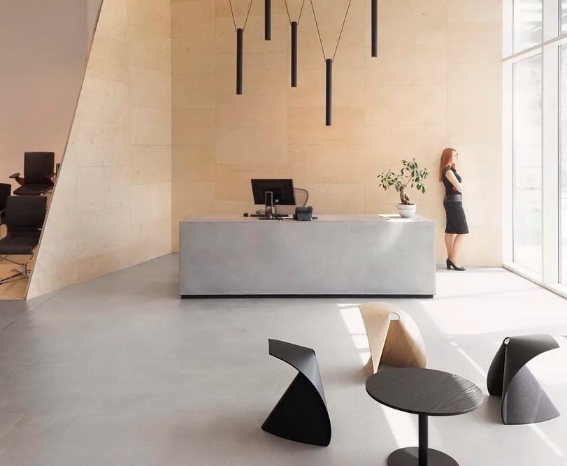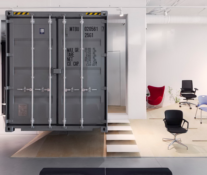 辦公室裝修傾斜的膠合板平臺允許椅子的高度安排,并通過這種方式暴露在每一個觀賞點。這個木制元素垂直向上,動態(tài)地圍繞著接待區(qū),“引導(dǎo)”顧客從展廳的入口到經(jīng)理區(qū)。在集裝箱和膠合板平臺外,整個辦公室裝修空間的設(shè)計盡量減少使用材料-混凝土地板、白色墻壁、天花板和設(shè)施。這一設(shè)計,結(jié)合航運集裝箱,辦公室裝修創(chuàng)造了一個簡單的工業(yè)外觀,強(qiáng)調(diào)復(fù)雜的模式和精確的細(xì)節(jié)所展示的家具。