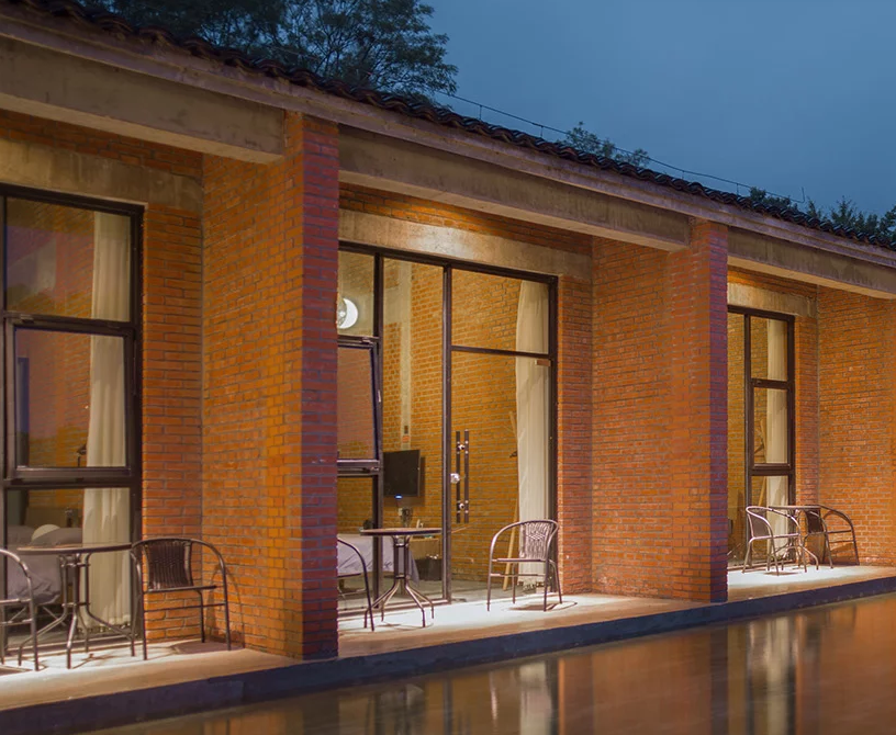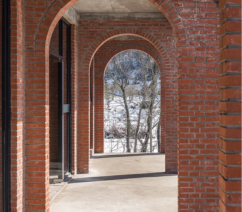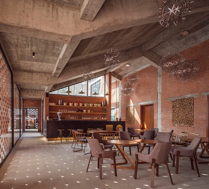 該大樓是大別山戶外露營公園的重要組成部分,酒店裝修包括客房,咖啡廳,茶館和禮堂,可用于公共聚會和培訓項目,以及冥想空間。建筑師認為,中國傳統建筑中最具吸引力的部分是房屋,庭院和道路之間的關系,因此功能是通過多層途徑交織在一起的。不同空間特征的私密庭院是交叉的建筑物,而復雜甚至隱藏的路徑鼓勵游客在場地周圍找到自己的方式。該建筑的主要材料是紅磚,通常在20世紀80年代使用。水磨石地板和室內墻壁上的外露材料增添了設計師想要喚起的田園感。